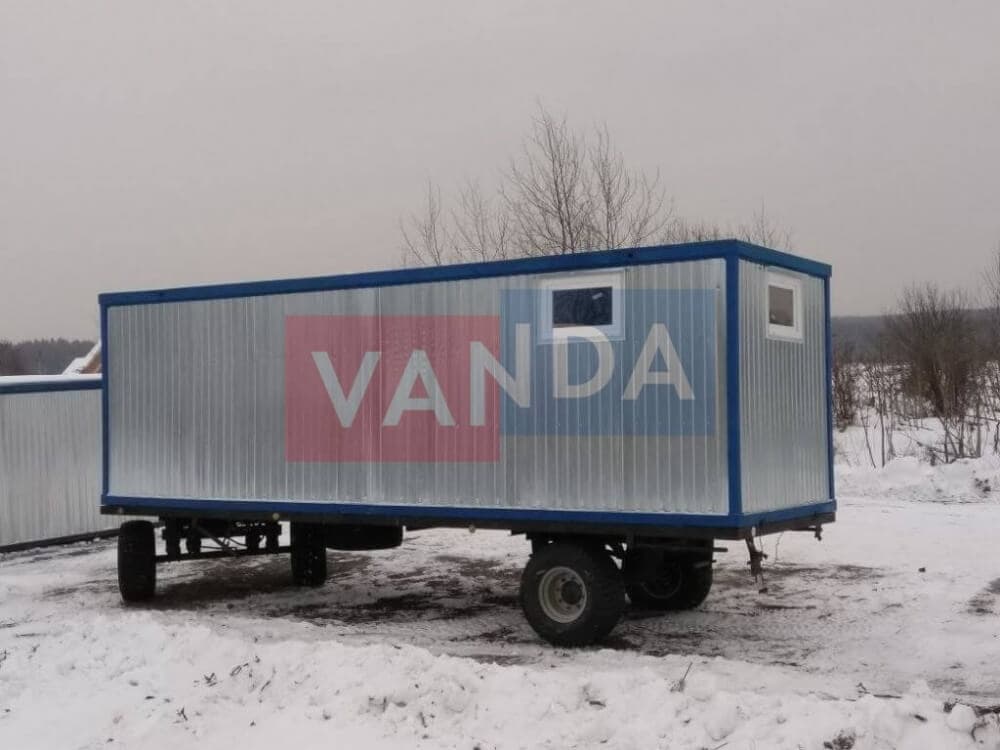 Контейнер на колесах состоит из металлического каркаса, который выполнен из профиля и укреплен сварным швом. Крыша покрыта листовым холоднокатанным окрашенным сварным металлом. Внешняя сторона стен обшита оцинкованным профнастилом. Внутренний каркас вагончика изготовлен из бруса. По всему периметру помещение утеплено и пароизолировано. Внутренняя отделка осуществляется по выбору заказчика. Это может быть вагонка или оргалитовые листы. Пол вагончика состоит из обрезной доски, пароизоляции, утепления поверх которого уложены ДСП. Вагончик оборудован дверью из оргалита и деревянными окнами с двойным остеклением.